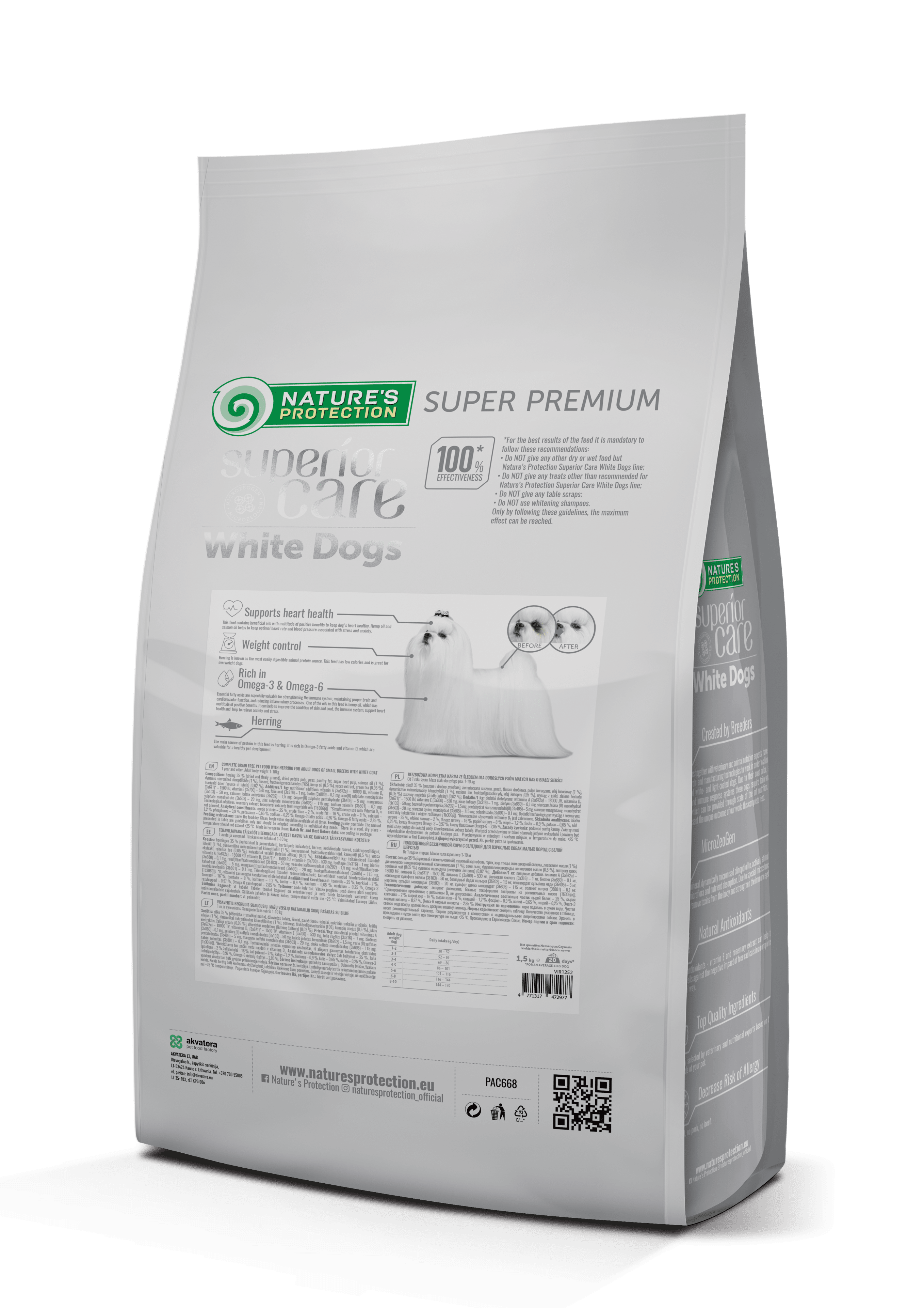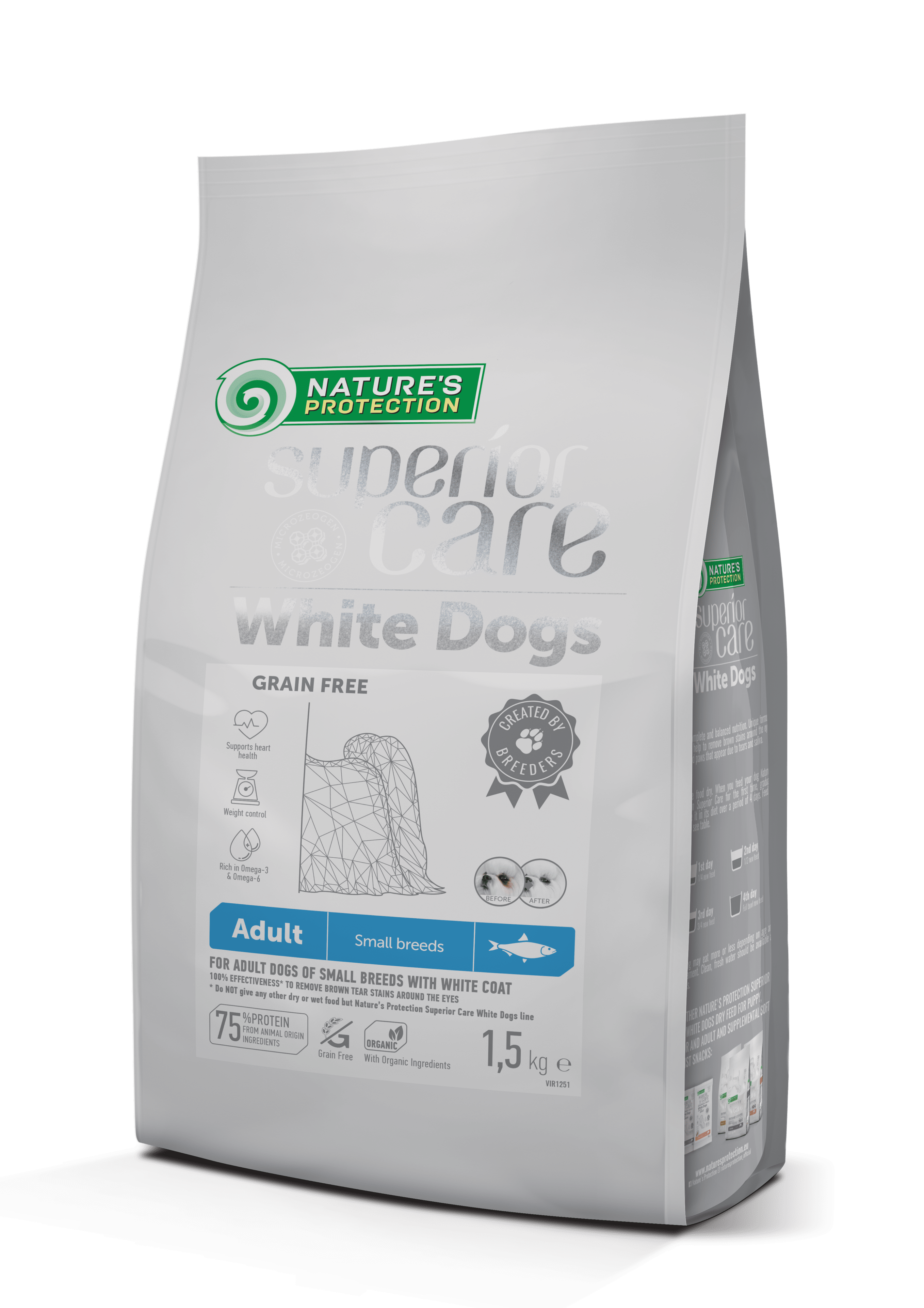 „Nature”s Protection White Dog Grain Free with Herring Adult Small Breed ” – aukščiausios klasės pašaras su silke, specialiai sukurtas suaugusiems mažų veislių baltakailiams šunims.