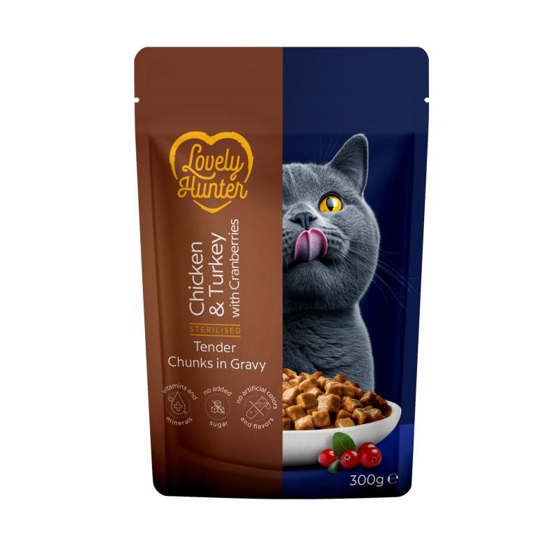 SKONIS, KURĮ RENKASI KATĖS. Sterilizuotų kačių mityba reikalauja ypatingo balanso – mažiau kalorijų, daugiau dėmesio šlapimo sistemai ir bendrai sveikatai. Lovely Hunter šlapias maistas su vištiena, kalakutiena ir spanguolėmis sukurtas taip, kad kasdien prisidėtų prie sterilizuotų kačių gerovės.
