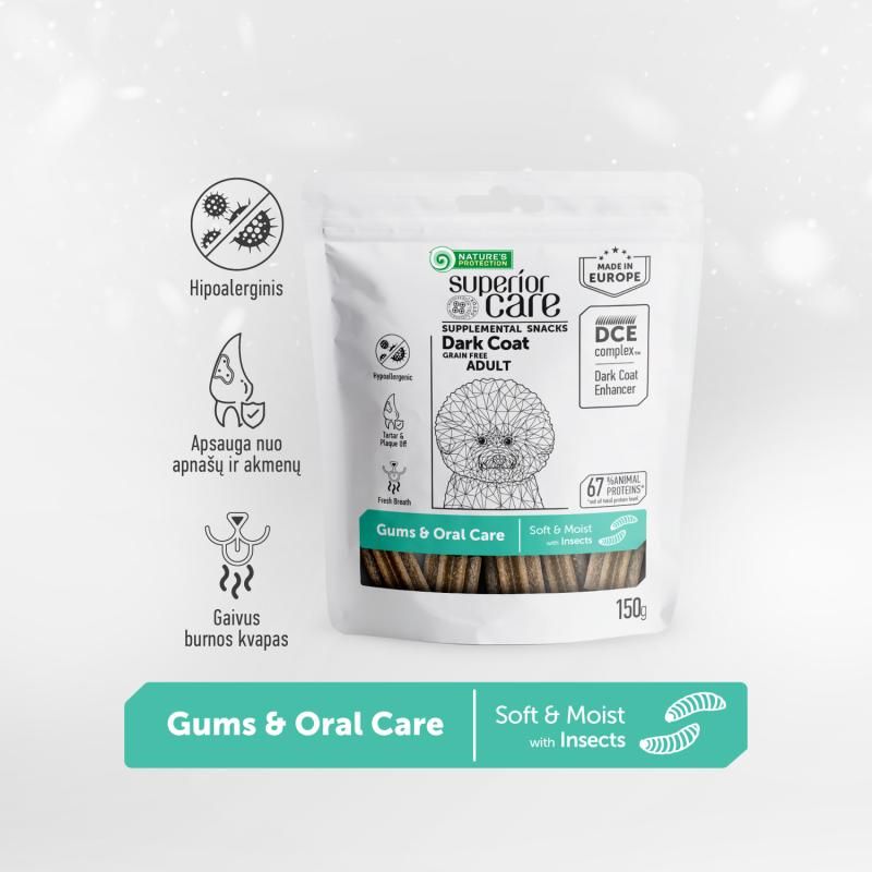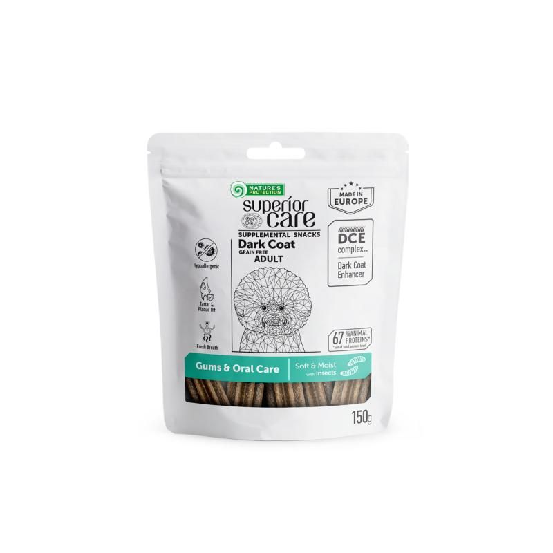 „Nature’s Protection Superior Care Dark Coat Grain-Free Gums & Oral Care“ – aukščiausios kokybės pašaro papildai/skanėstai, skirtas suaugusiems, tamsaus kailio visų veislių šunims. Praturtinti vabzdžių baltymais, šie unikalūs skanėstai padeda palaikyti burnos ertmės sveikatą, mažina apnašų ir akmenų susidarymą bei užtikrina gaivų kvapą.