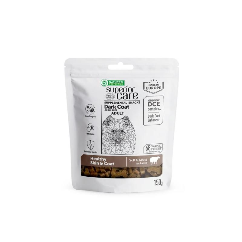 Nature’s Protection Superior Care Dark Coat Grain-Free Healthy Skin & Coat – высококачественная пищевая добавка-лакомство, разработанное для взрослых собак всех пород с темным окрасом шерсти. Обогащенное высококачественной бараниной, лакомство способствует поддержанию здоровью кожи и шерсти, а также ее блеску.